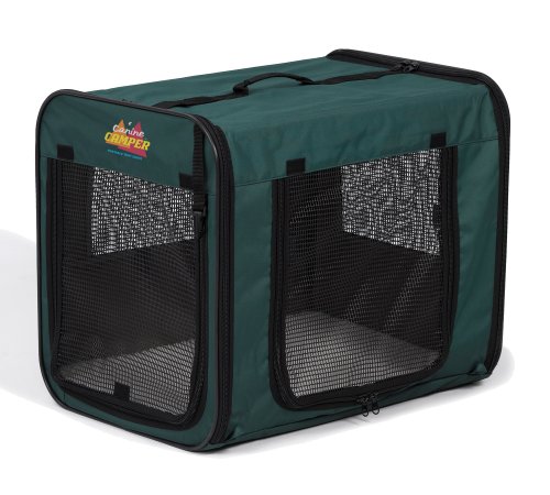 Convenience and security wrapped up in a easy to transport package! The Canine Camper Double Door provides your pet with a the comfort of home on any of your travels. Now with a front and side door making it very is to fit into any space! The Canine Camper Double Door is constructed of 600 Denier fabric backed with PVC for easy cleanup and durability. The easy pop-up Zip-up configuration makes it easy for anyone to setup and the light wire frame construction insures the security of the pet inside and the furniture on the outside. The Canine Camper Double Door has the highest tear strength net on the market and still provides your pet with optimum ventilation and visibility. There Canine Camper Double Door also comes with pockets on two sides to store all your accessories, a removal privacy flap for bed time, metal stacks for securing the crate to the ground, a bucket loop for food or water and a very easy to use carrying tote to store the Canine Camper when not in use. It has it All! This crate is not intended for puppy's or chronic chewers!Buy Midwest Canine Camper Double Door Soft Sided Crate, 48 Inches by 31 Inches by 35 Inches